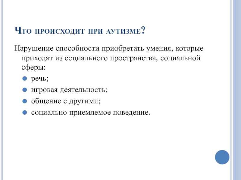 характерны обширные отклонения в социальных взаимодействиях и коммуникации, а также узость интересов и явно повторяющееся поведение.