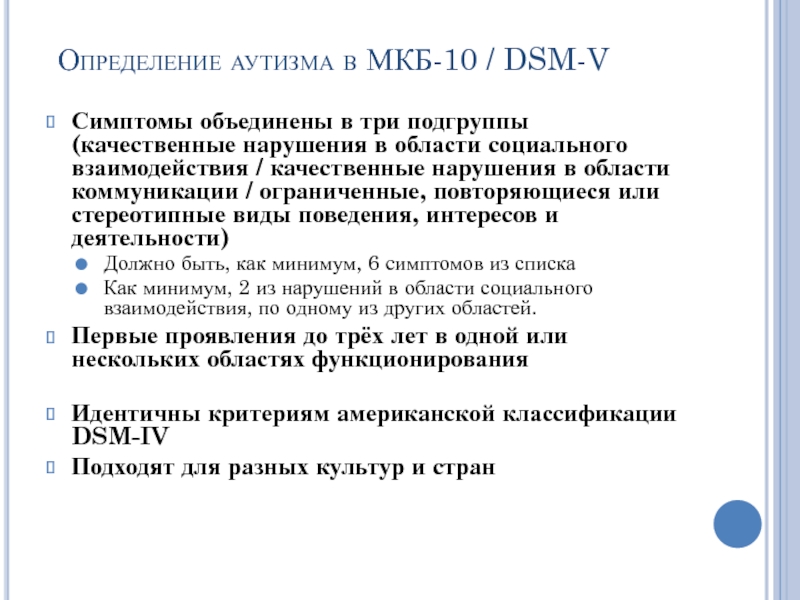 Слайд 12 Определение аутизма в МКБ-10 / DSM-V