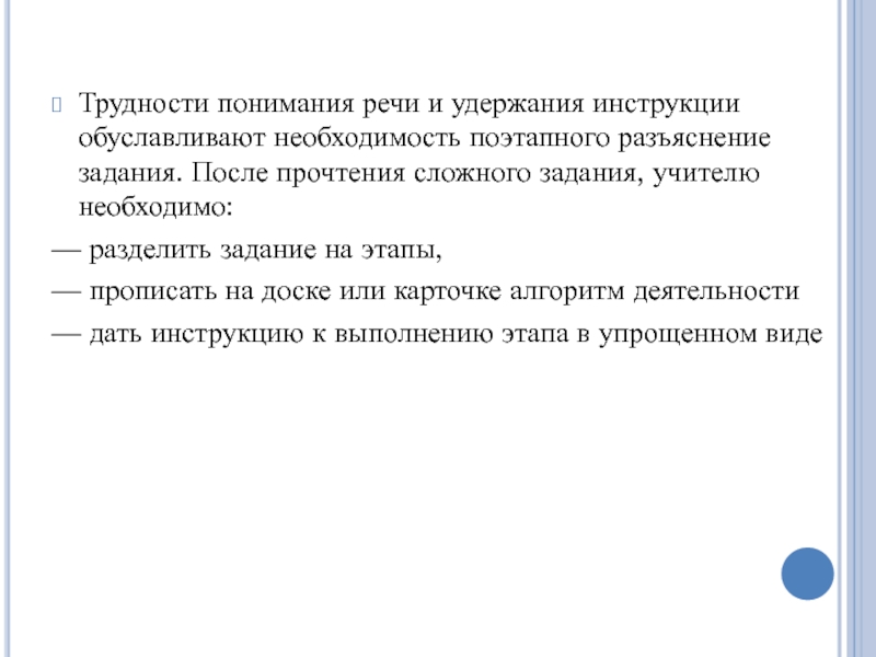 Слайд 33Трудности понимания речи и удержания инструкции обуславливают необходимость поэтапного разъяснение задания.