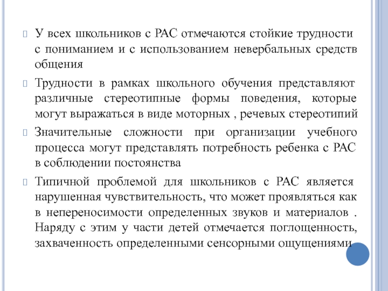 Слайд 19У всех школьников с РАС отмечаются стойкие трудности с пониманием и