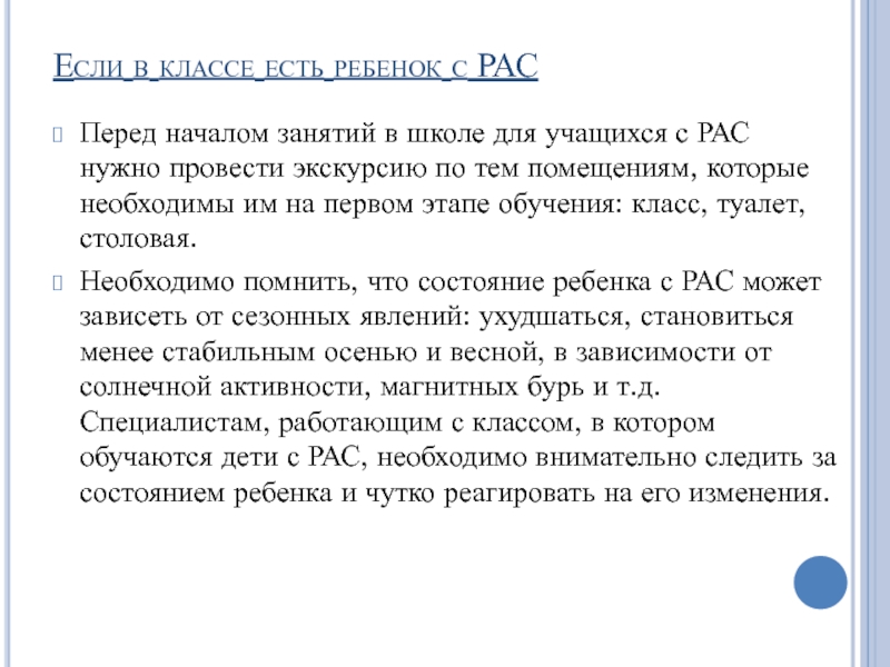 Необходимо помнить, что состояние ребенка с РАС может зависеть от сезонных явлений: ухудшаться, становиться менее стабильным осенью и весной, в зависимости от солнечной активности, магнитных бурь и т.д. Специалистам, работающим с классом, в котором обучаются дети с РАС, необходимо внимательно следить за состоянием ребенка и чутко реагировать на его изменения.