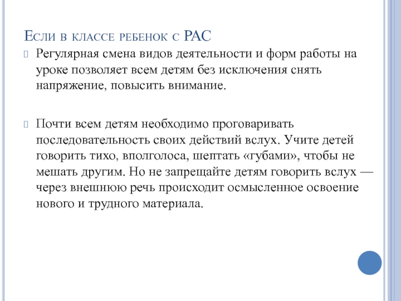 Почти всем детям необходимо проговаривать последовательность своих действий вслух. Учите детей говорить тихо, вполголоса, шептать «губами», чтобы не мешать другим. Но не запрещайте детям говорить вслух — через внешнюю речь происходит осмысленное освоение нового и трудного материала.
