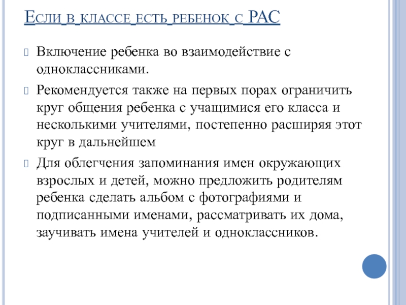 Рекомендуется также на первых порах ограничить круг общения ребенка с учащимися его класса и несколькими учителями, постепенно расширяя этот круг в дальнейшем