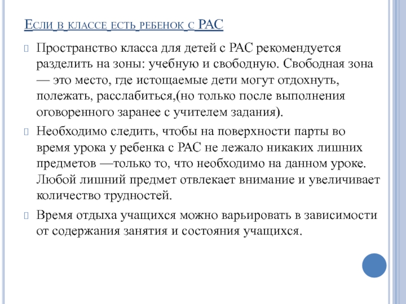 РАС рекомендуется разделить на зоны: учебную и свободную. Свободная зона — это место, где истощаемые дети могут отдохнуть, полежать, расслабиться,(но только после выполнения оговоренного заранее с учителем задания).