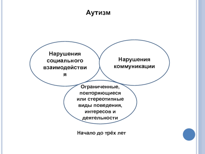 (качественные нарушения в области социального взаимодействия / качественные нарушения в области коммуникации / ограниченные, повторяющиеся или стереотипные виды поведения, интересов и деятельности)