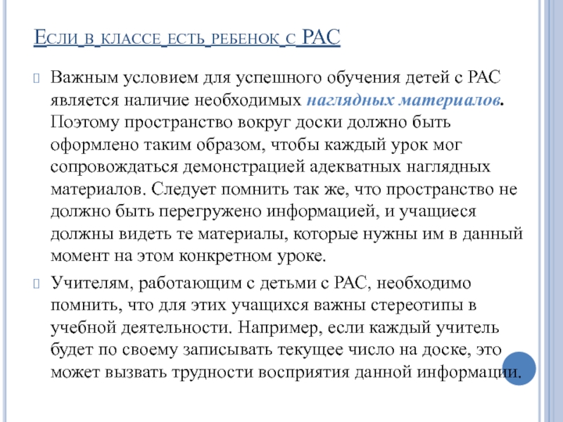детей с РАС является наличие необходимых наглядных материалов. Поэтому пространство вокруг доски должно быть оформлено таким образом, чтобы каждый урок мог сопровождаться демонстрацией адекватных наглядных материалов. Следует помнить так же, что пространство не должно быть перегружено информацией, и учащиеся должны видеть те материалы, которые нужны им в данный момент на этом конкретном уроке.