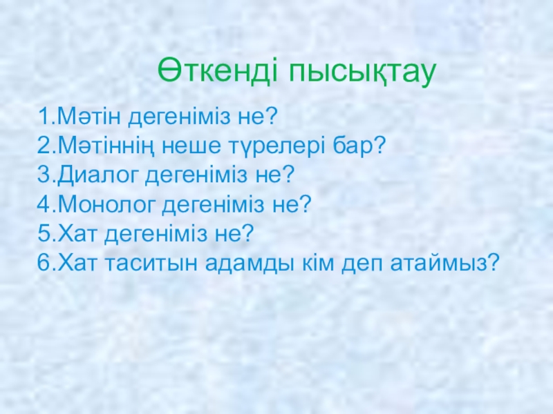 Өткенді пысықтау  1.Мәтін дегеніміз не? 2.Мәтіннің неше түрелері бар? 3.Диалог дегеніміз не? 4.Монолог дегеніміз не? 5.Хат