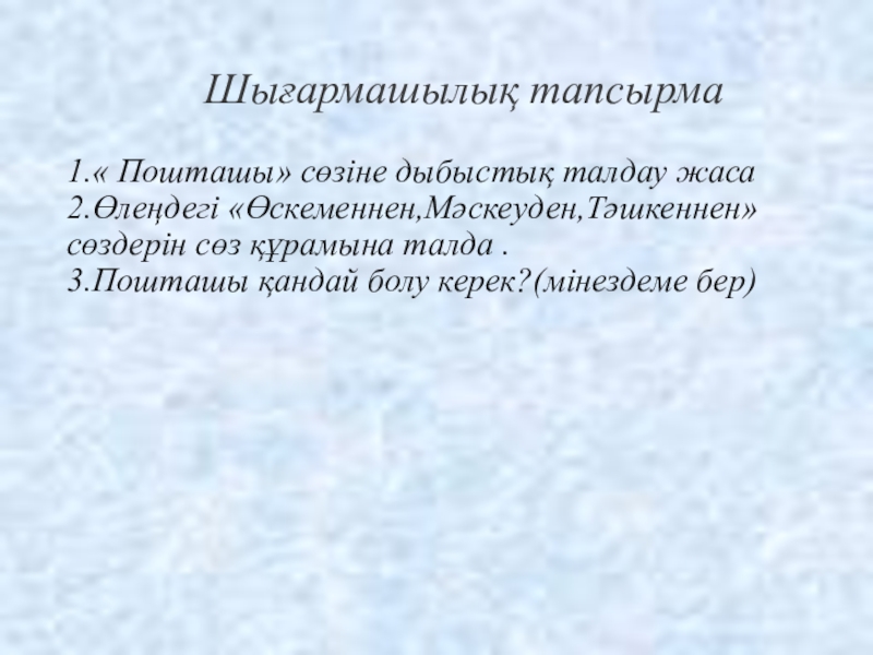 Шығармашылық тапсырма1.« Пошташы» сөзіне дыбыстық талдау жаса 2.Өлеңдегі «Өскеменнен,Мәскеуден,Тәшкеннен» сөздерін сөз құрамына талда . 3.Пошташы қандай