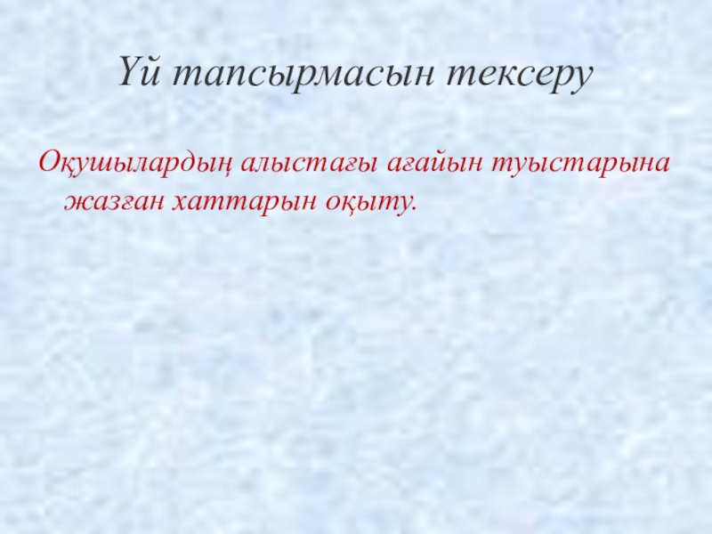 Үй тапсырмасын тексеруОқушылардың алыстағы ағайын туыстарына жазған хаттарын оқыту.