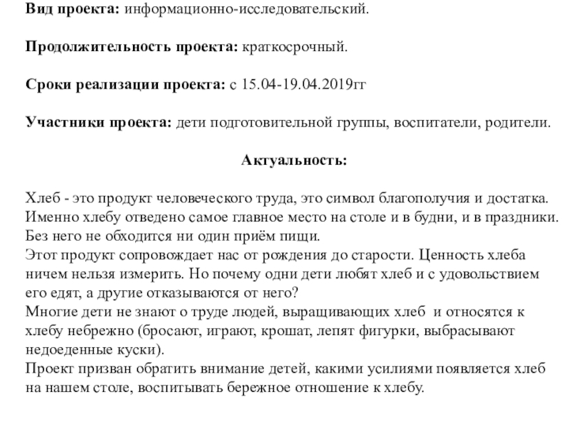 Расширять представление детей о многообразии хлебных продуктов; расширить знания у детей о значении хлеба в жизни человека; показать, каким трудом добывается хлеб для народа и каждого из нас; учить применять полученные знания в продуктивных видах деятельности; побуждать к активным действиям в совместной деятельности со взрослыми и детьми.