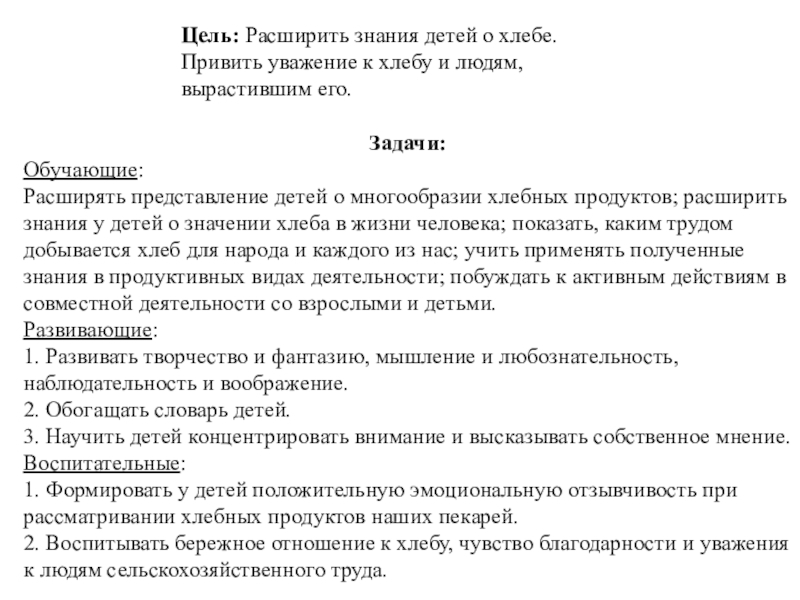 2. Воспитывать бережное отношение к хлебу, чувство благодарности и уважения к людям сельскохозяйственного труда.