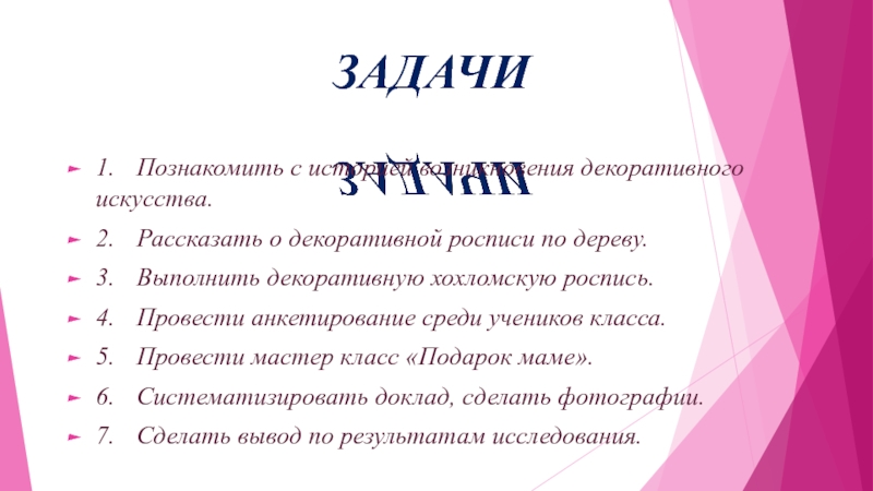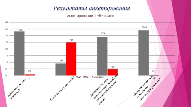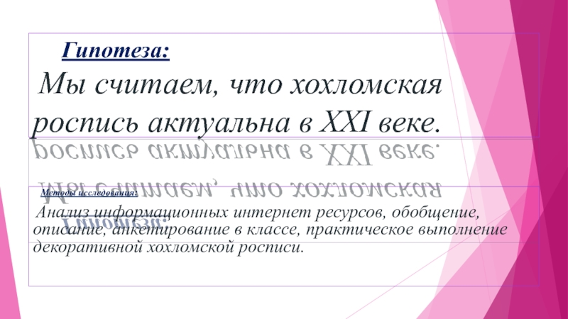 Анализ информационных интернет ресурсов, обобщение, описание, анкетирование в классе, практическое выполнение декоративной хохломской росписи.