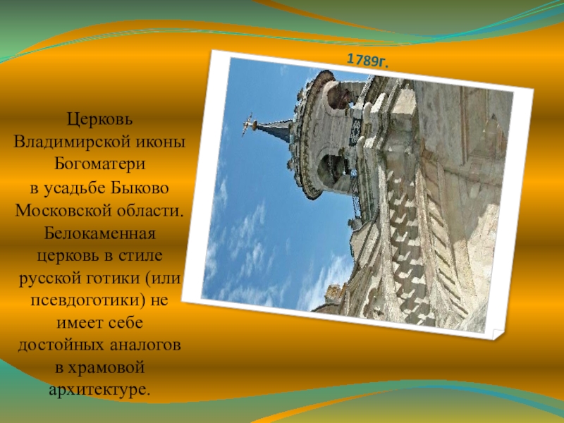 1789г.Церковь Владимирской иконы Богоматери в усадьбе Быково Московской области. Белокаменная церковь в стиле русской готики (или псевдоготики)