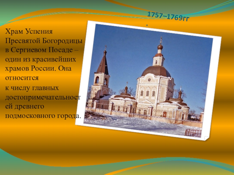 1757–1769гг.Храм Успения Пресвятой Богородицы в Сергиевом Посаде – один из красивейших храмов России. Она относится к числу