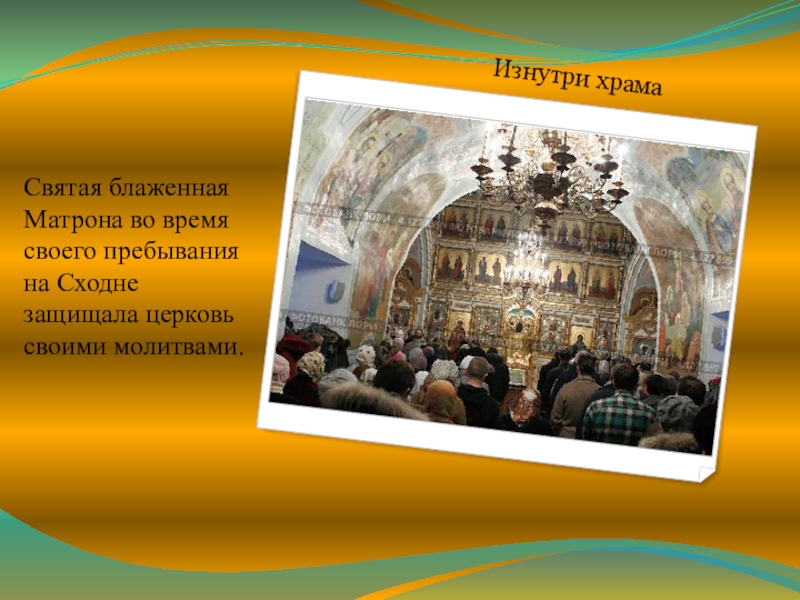 Изнутри храмаСвятая блаженная Матрона во время своего пребывания на Сходне защищала церковь своими молитвами.