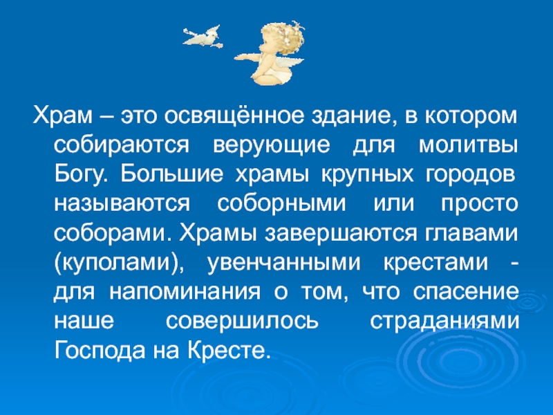 Храм – это освящённое здание, в котором собираются верующие для молитвы Богу. Большие храмы крупных городов называются соборными или просто соборами. Храмы завершаются главами (куполами), увенчанными крестами - для напоминания о том, что спасение наше совершилось