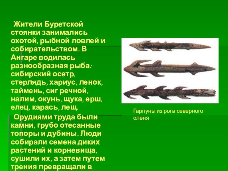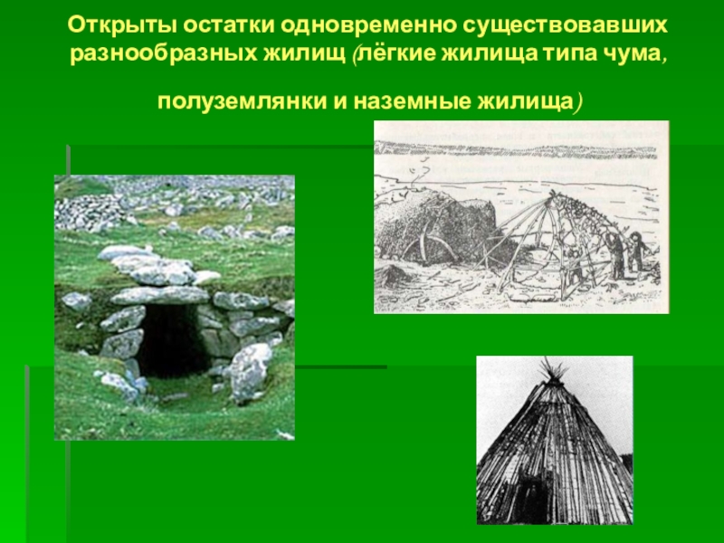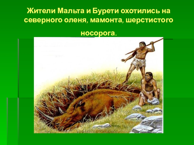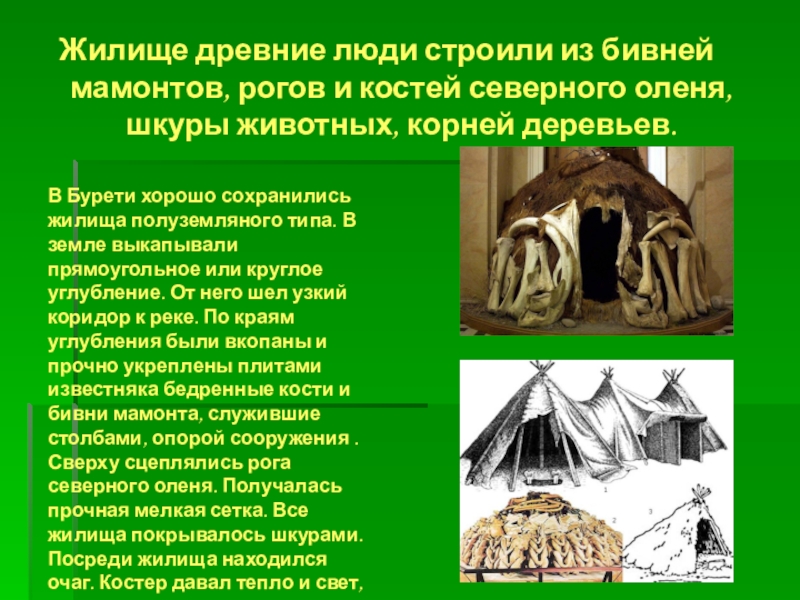 В Бурети хорошо сохранились жилища полуземляного типа. В земле выкапывали прямоугольное или круглое углубление. От него шел узкий коридор к реке. По краям углубления были вкопаны и прочно укреплены плитами известняка бедренные кости и бивни мамонта, служившие столбами, опорой сооружения . Сверху сцеплялись рога северного оленя. Получалась прочная мелкая сетка. Все жилища покрывалось шкурами. Посреди жилища находился очаг. Костер давал тепло и свет, на нем же готовили пищу.