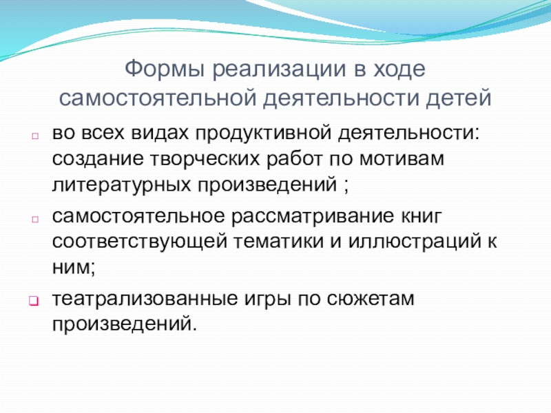 Слайд 10Формы реализации в ходе самостоятельной деятельности детей