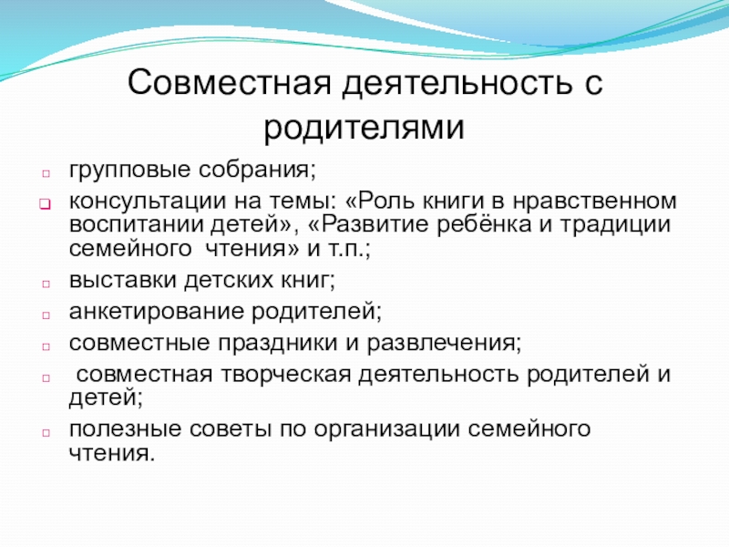 воспитании детей», «Развитие ребёнка и традиции семейного чтения» и т.п.;