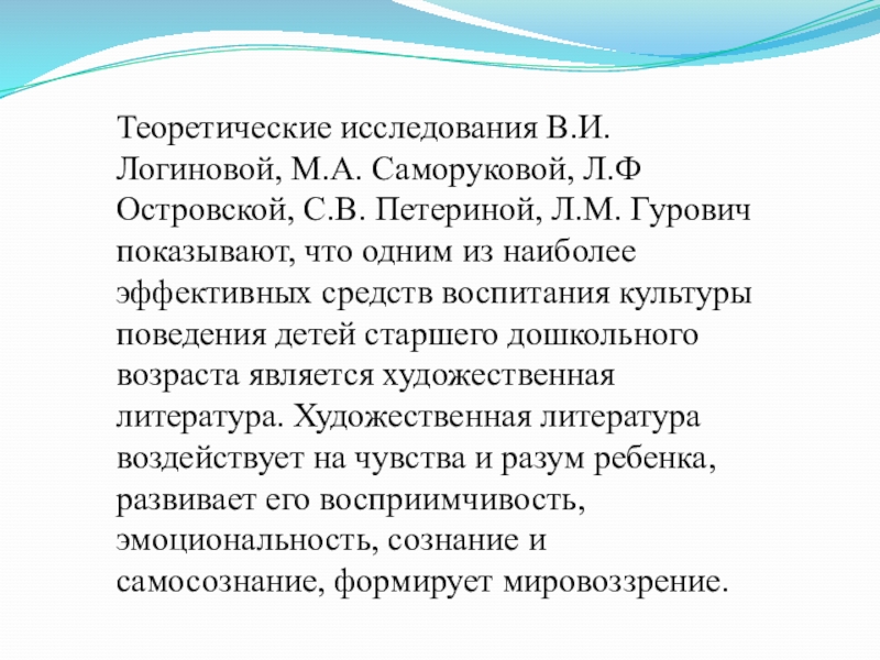 Слайд 5Теоретические исследования В.И. Логиновой, М.А. Саморуковой, Л.Ф Островской, С.В. Петериной, Л.М.