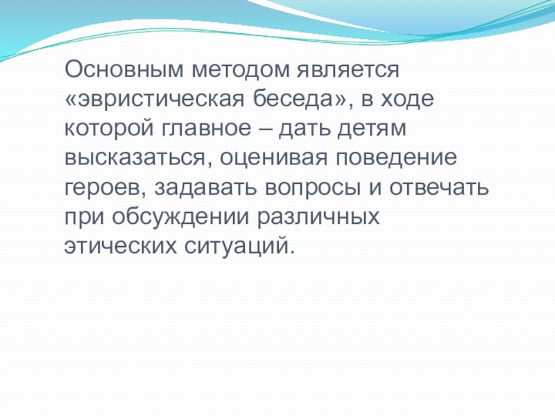 Слайд 13Основным методом является «эвристическая беседа», в ходе которой главное – дать