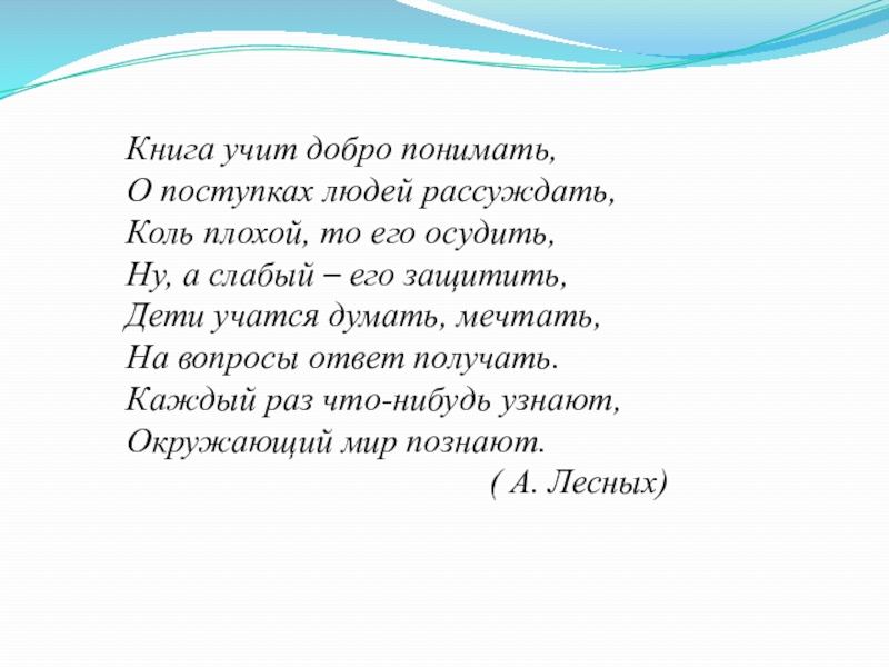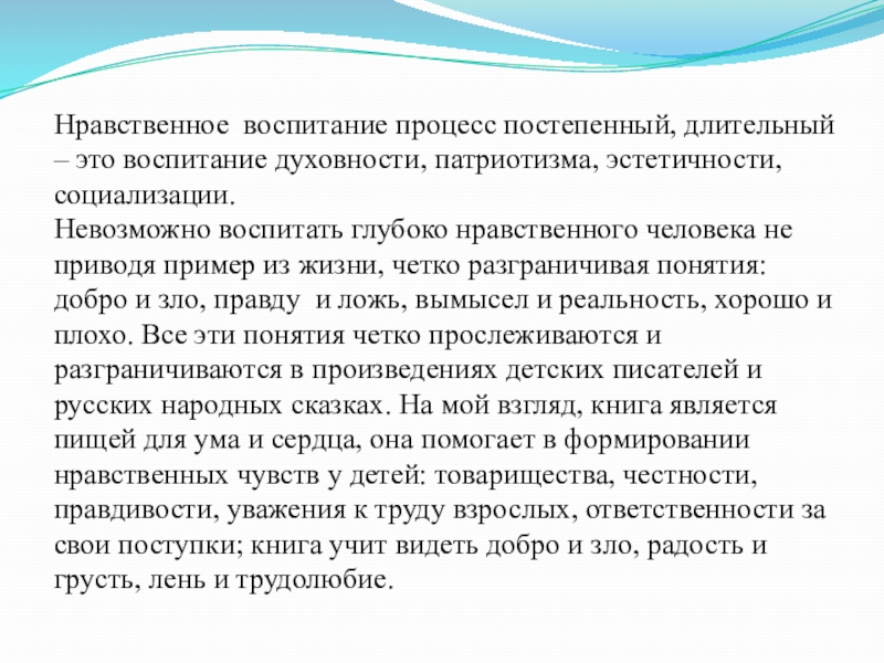 Невозможно воспитать глубоко нравственного человека не приводя пример из жизни, четко разграничивая понятия: добро и зло, правду и ложь, вымысел и реальность, хорошо и плохо. Все эти понятия четко прослеживаются и разграничиваются в произведениях детских писателей и русских народных сказках. На мой взгляд, книга является пищей для ума и сердца, она помогает в формировании нравственных чувств у детей: товарищества, честности, правдивости, уважения к труду взрослых, ответственности за свои поступки; книга учит видеть добро и зло, радость и грусть, лень и трудолюбие.