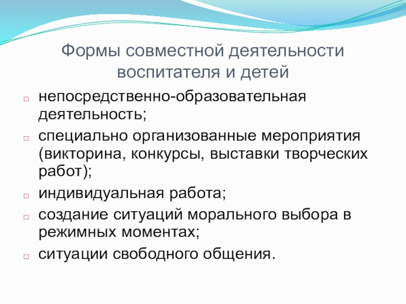 Слайд 9Формы совместной деятельности воспитателя и детей