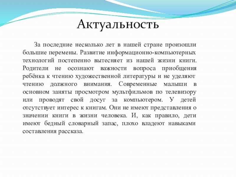 информационно-компьютерных технологий постепенно вытесняет из нашей жизни книги. Родители не осознают важности вопроса приобщения ребёнка к чтению художественной литературы и не уделяют чтению должного внимания. Современные малыши в основном заняты просмотром мультфильмов по телевизору или проводят свой досуг за компьютером. У детей отсутствует интерес к книгам. Они не имеют представления о значении книги в жизни человека. И, как правило, дети имеют бедный словарный запас, плохо владеют навыками составления рассказа.