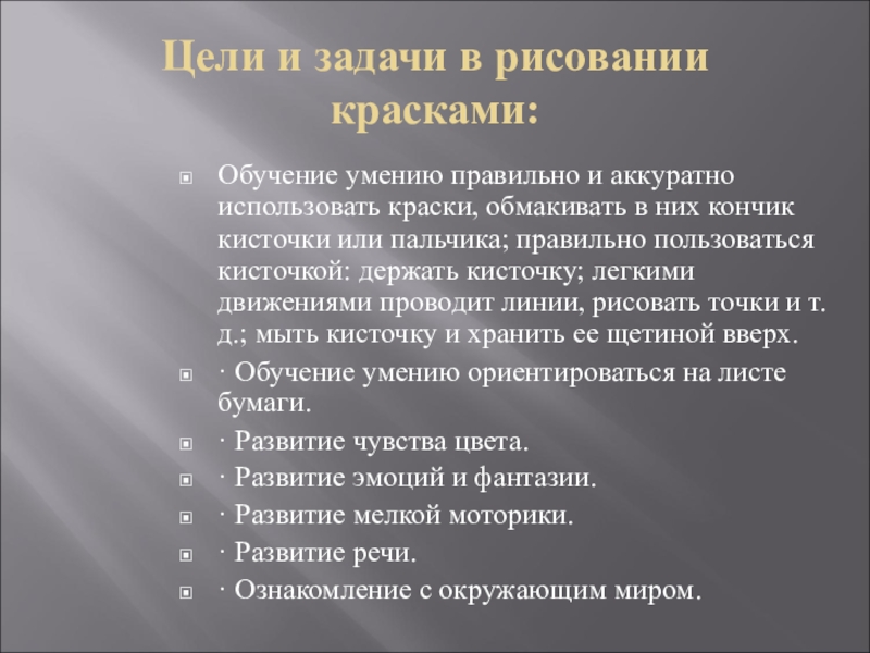 краски, обмакивать в них кончик кисточки или пальчика; правильно пользоваться кисточкой: держать кисточку; легкими движениями проводит линии, рисовать точки и т.д.; мыть кисточку и хранить ее щетиной вверх.