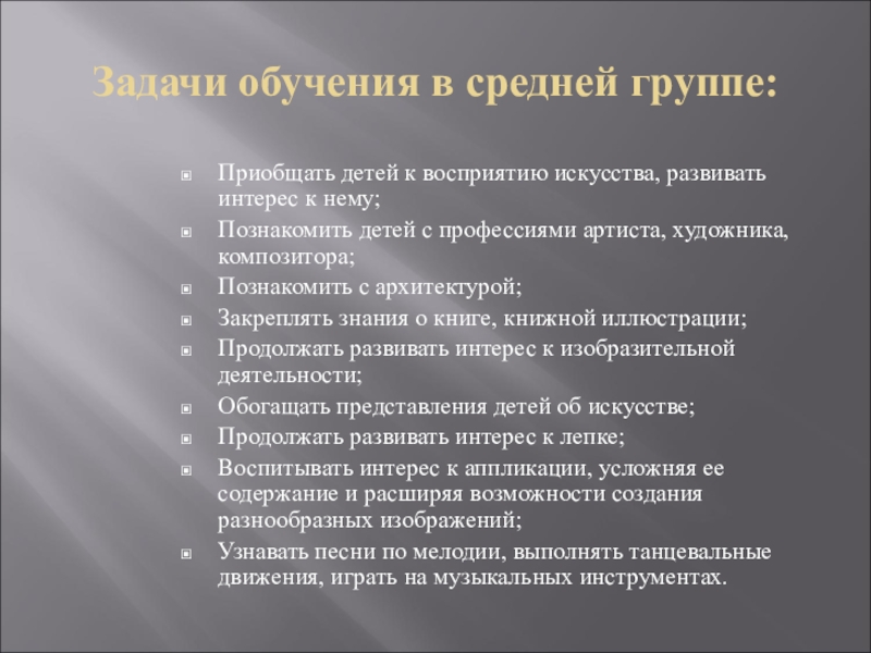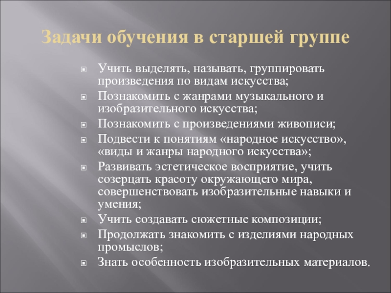 развитие предпосылок ценностно-смыслового восприятия и понимания произведений искусства (словесного, музыкального, изобразительного), мира природы; становление эстетического отношения к окружающему миру; формирование элементарных представлений о видах искусства; восприятие музыки, художественной литературы, фольклора; стимулирование сопереживания персонажам художественных произведений; реализацию самостоятельной творческой деятельности детей (изобразительной, конструктивно-модельной, музыкальной и др.).