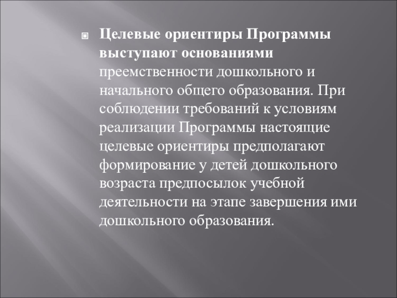 Слайд 25Целевые ориентиры Программы выступают основаниями преемственности дошкольного и начального общего образования.
