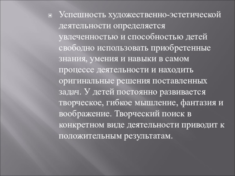 Слайд 23Успешность художественно-эстетической деятельности определяется увлеченностью и способностью детей свободно использовать приобретенные