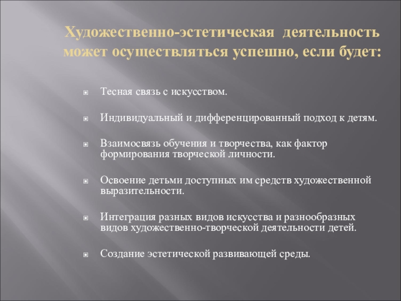 Слайд 11Художественно-эстетическая деятельность может осуществляться успешно, если будет: