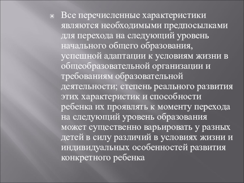 начального общего образования, успешной адаптации к условиям жизни в общеобразовательной организации и требованиям образовательной деятельности; степень реального развития этих характеристик и способности ребенка их проявлять к моменту перехода на следующий уровень образования может существенно варьировать у разных детей в силу различий в условиях жизни и индивидуальных особенностей развития конкретного ребенка