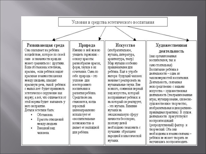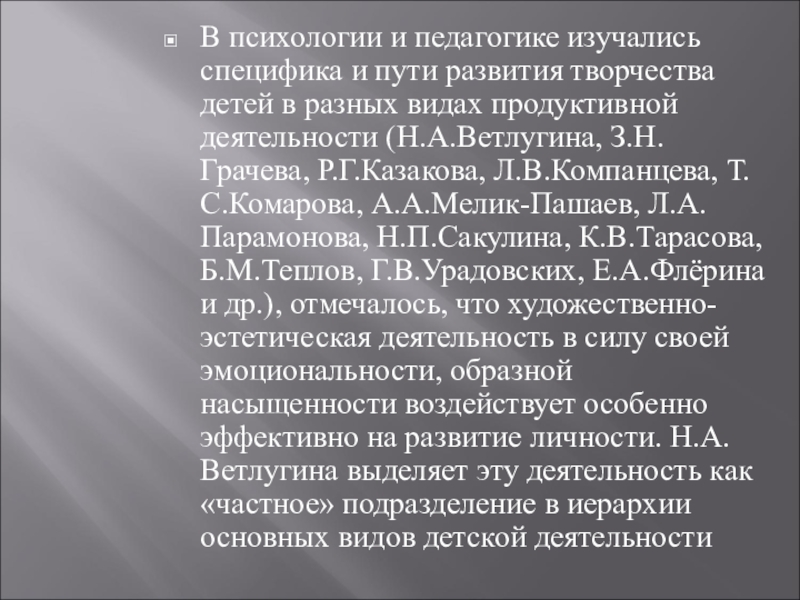 в разных видах продуктивной деятельности (Н.А.Ветлугина, З.Н.Грачева, Р.Г.Казакова, Л.В.Компанцева, Т.С.Комарова, А.А.Мелик-Пашаев, Л.А.Парамонова, Н.П.Сакулина, К.В.Тарасова, Б.М.Теплов, Г.В.Урадовских, Е.А.Флёрина и др.), отмечалось, что художественно-эстетическая деятельность в силу своей эмоциональности, образной насыщенности воздействует особенно эффективно на развитие личности. Н.А.Ветлугина выделяет эту деятельность как «частное» подразделение в иерархии основных видов детской деятельности