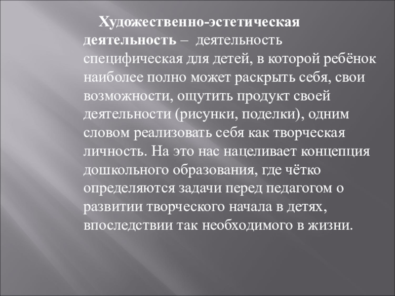 Слайд 6Художественно-эстетическая деятельность – деятельность специфическая для детей, в которой ребёнок наиболее