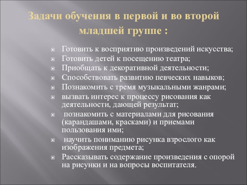 Слайд 12Задачи обучения в первой и во второй младшей группе :