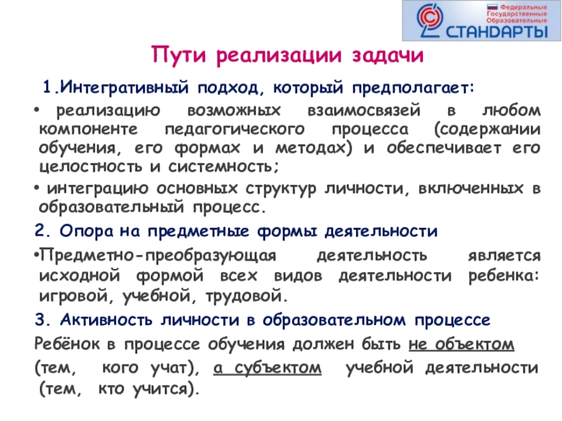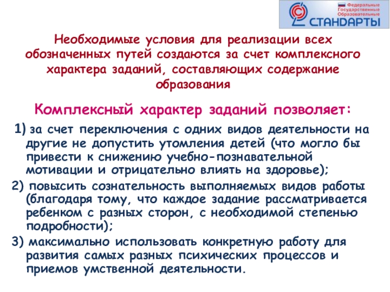 Необходимые условия для реализации всех обозначенных путей создаются за счет комплексного характера заданий, составляющих содержание образования