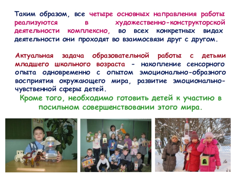 Таким образом, все четыре основных направления работы реализуются в художественно-конструкторской деятельности комплексно, во всех конкретных видах деятельности они проходят во взаимосвязи друг с другом.