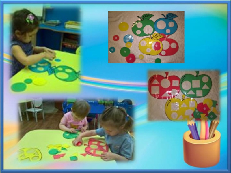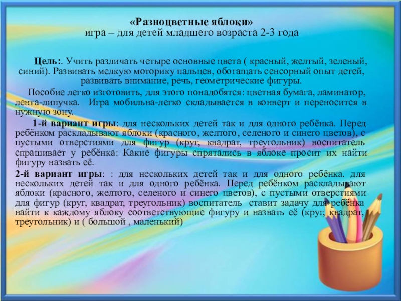 1-й вариант игры: для нескольких детей так и для одного ребёнка. Перед ребёнком раскладывают яблоки (красного, желтого, селеного и синего цветов), с пустыми отверстиями для фигур (круг, квадрат, треугольник) воспитатель спрашивает у ребёнка: Какие фигуры спрятались в яблоке просит их найти фигуру назвать её.