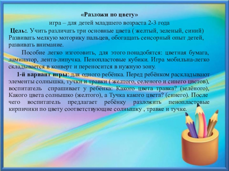 Цель:. Учить подбирать предметы по цвету, правильно называть цвета. Развивать мелкую моторику. Учить выполнять постепенно усложняющиеся правила.