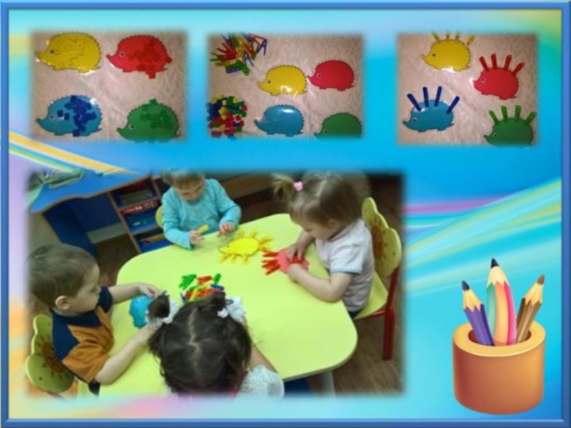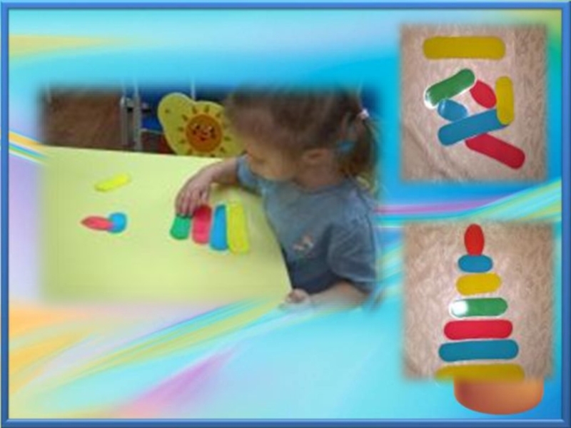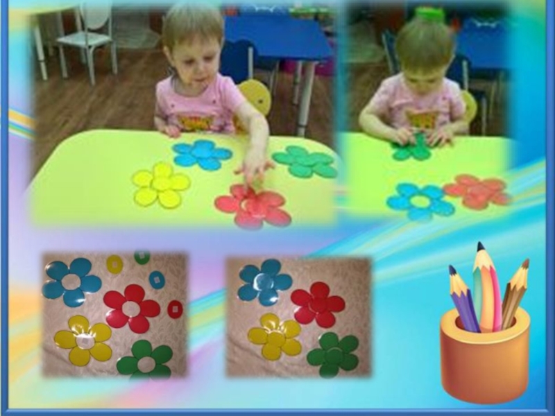 Цель:. Учить различать четыре основные цвета ( красный, желтый, зеленый, синий). Развивать мелкую моторику пальцев, обогащать сенсорный опыт детей, развивать внимание, речь, геометрические фигуры.