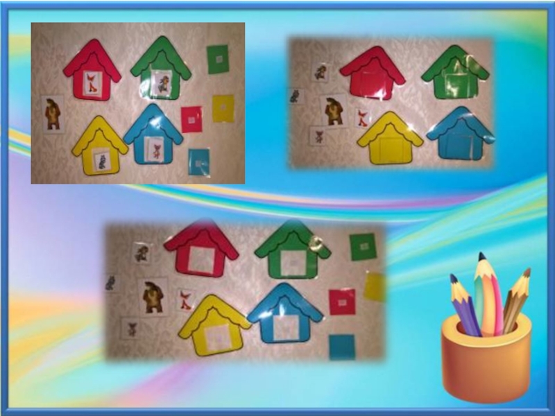 2-й вариант игры: для одного ребенка раскладываются на столе четыре домика четырёх цветов: красный, желтый, зеленый синий в середине каждого картинка- «за дверцей» выглядывают зверушки; отдельно четыре дверцы к домикам таких же цветов. Словесным указанием воспитатель задает сюжет: «Медведь испугал зверушек, и они спрятались в свои домики. Надо помочь им закрыть дверцы в домиках, помоги, пожалуйста. Как ты, думаешь, какая дверца подойдет зайке, какая лисичкеи т. д.»? Ребенок должен самостоятельно справиться с заданием, подобрав к каждому домику нужную дверцу.