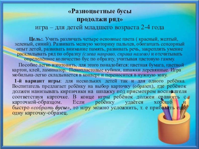 Цель:. Учить различать четыре основные цвета ( красный, желтый, зеленый, синий). Развивать мелкую моторику пальцев, обогащать сенсорный опыт детей, развивать внимание память, развивать речь, закреплять умение раскладывать ряд по образцу (слева направо, справа налево) и отсчитывать определённое количество бус по образцу, учитывая цветовую гамму.