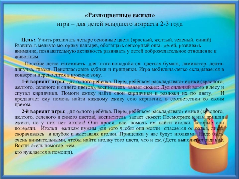 1-й вариант игры: для одного ребёнка. Перед ребёнком раскладывают ежики (красного, желтого, селеного и синего цветов), воспитатель задает сюжет: Дул сильный ветер в лесу и спутал кирпичики. Помоги ежику найти свои кирпичики и разложи их по цвету. И предлагает ему помочь найти каждому ежику сою кирпичик, в соответствии со своим цветом.