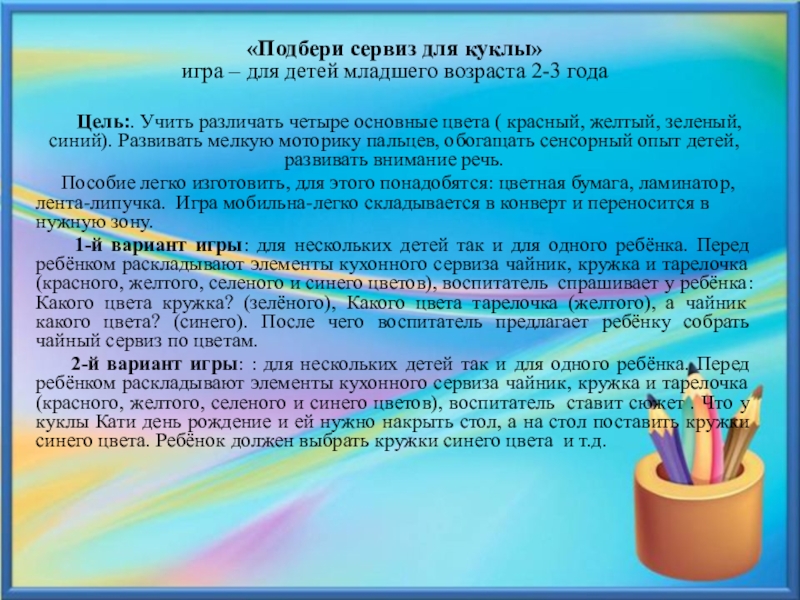2-й вариант игры: : для нескольких детей так и для одного ребёнка. Перед ребёнком раскладывают элементы кухонного сервиза чайник, кружка и тарелочка (красного, желтого, селеного и синего цветов), воспитатель ставит сюжет . Что у куклы Кати день рождение и ей нужно накрыть стол, а на стол поставить кружки синего цвета. Ребёнок должен выбрать кружки синего цвета и т.д.