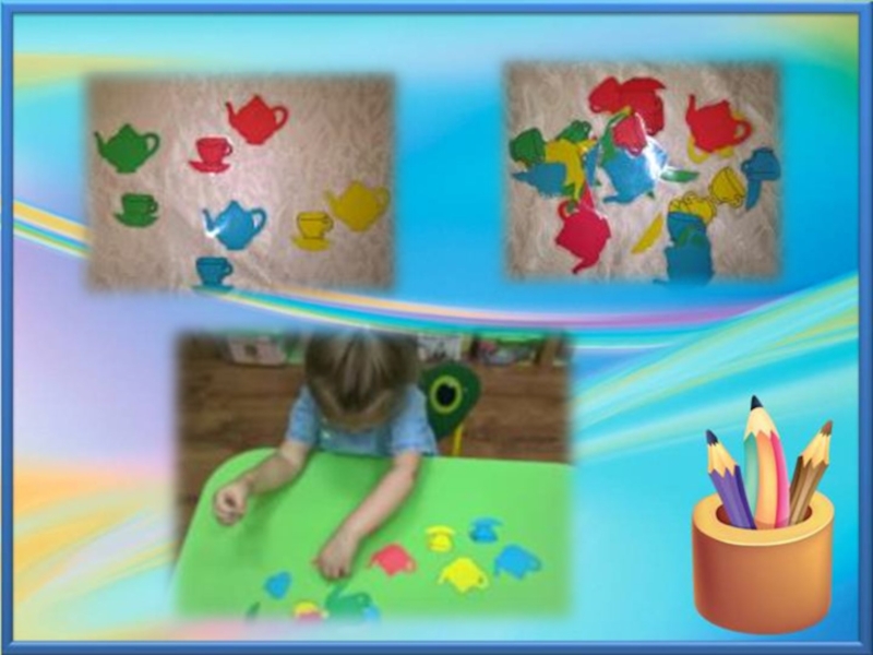 1-й вариант игры: для нескольких детей так и для одного ребёнка. Перед ребёнком раскладывают элементы кухонного сервиза чайник, кружка и тарелочка (красного, желтого, селеного и синего цветов), воспитатель спрашивает у ребёнка: Какого цвета кружка? (зелёного), Какого цвета тарелочка (желтого), а чайник какого цвета? (синего). После чего воспитатель предлагает ребёнку собрать чайный сервиз по цветам.
