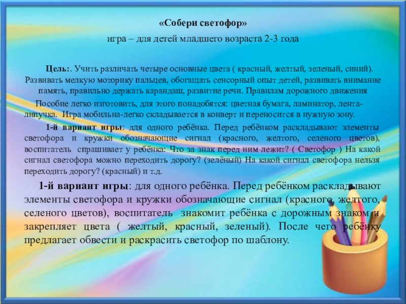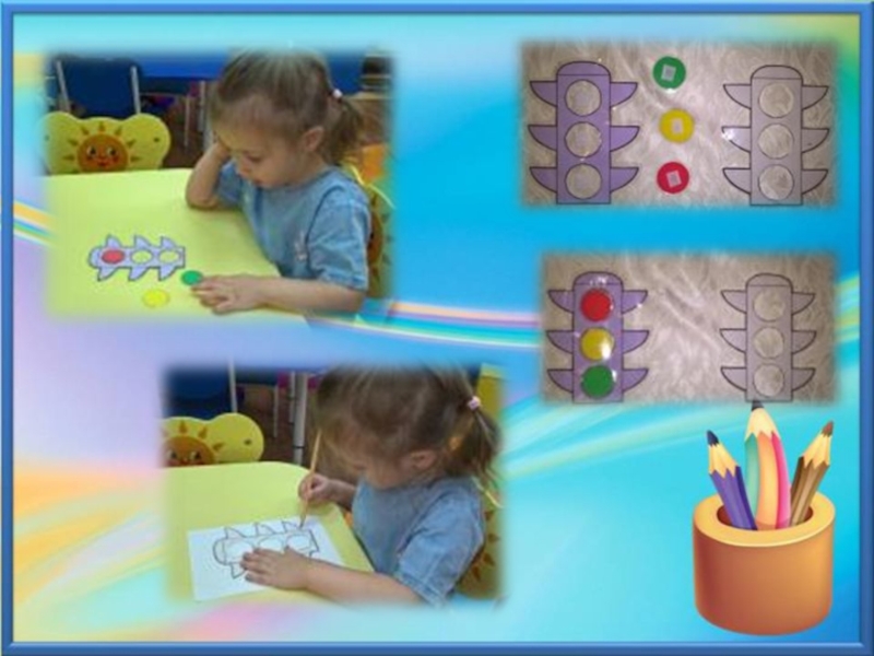 Цель:. Учить различать четыре основные цвета ( красный, желтый, зеленый, синий). Развивать мелкую моторику пальцев, обогащать сенсорный опыт детей, развивать внимание память, правильно держать карандаш, развитие речи. Правилам дорожного движения