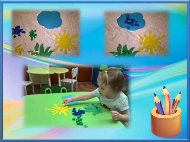 1-й вариант игры: для одного ребёнка. Перед ребёнком раскладывают элементы солнышка, тучки и травки ( желтого, селеного и синего цветов), воспитатель спрашивает у ребёнка: Какого цвета травка? (зелёного), Какого цвета солнышко (желтого), а Тучка какого цвета? (синего). После чего воспитатель предлагает ребёнку разложить пенопластовые кирпичики по цвету соответствующие солнышку , травке и тучке.