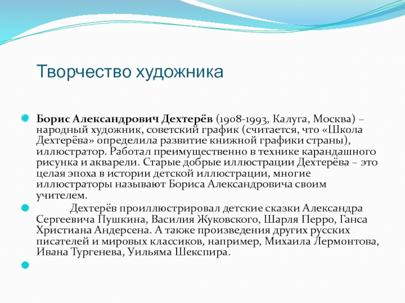 художник, советский график (считается, что «Школа Дехтерёва» определила развитие книжной графики страны), иллюстратор. Работал преимущественно в технике карандашного рисунка и акварели. Старые добрые иллюстрации Дехтерёва – это целая эпоха в истории детской иллюстрации, многие иллюстраторы называют Бориса Александровича своим учителем.
